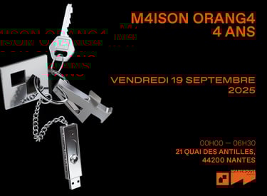 Tu n'as jamais vu le WAREHOUSE comme ça ! Le vendredi 19 septembre, MAISON ORANGE célèbre 4 ans de fête libre avec un format XXL jamais vu à Nantes : 4 SCÈNES, +20 ARTISTES POUR 4 UNIVERS TECHNO LA MÊME NUIT !